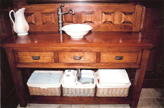 Ahhhh… Pine. This old farmhouse deserved a pine oasis. The pine vanity was custom made in our shop. The counter was created from aged Douglas Fir. The room has been lined with raised paneled wainscoting. We reclaimed the claw foot tub from a salvage yard and refinished it. The sink bowl and vase were also reclaimed. |