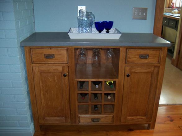 This cabinet features two closed door storage compartments, two upper drawers and one lower drawer. There is a nine bottle wine storage section and an open shelf with glass storage. The counter was also made by us. The counter is a cast concretethat was custom colored and polished. |