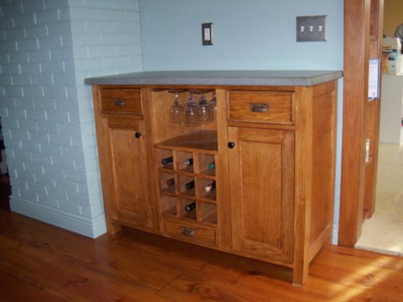 This cabinet features two closed door storage compartments, two upper drawers and one lower drawer. There is a nine bottle wine storage section and an open shelf with glass storage. The counter was also made by us. The counter is a cast concretethat was custom colored and polished. |