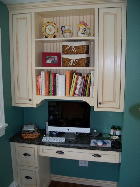 Upper and lower cabinets designed and built to compliment existing kitchen cabinetry. Upper cabinet features open shelving, bead board backing and two raised panel doors. Desk cabinets feature 2 file drawers and a large pencil drawer. Cabinets were painted and hand glazed to match the existing kitchen cabinets. |