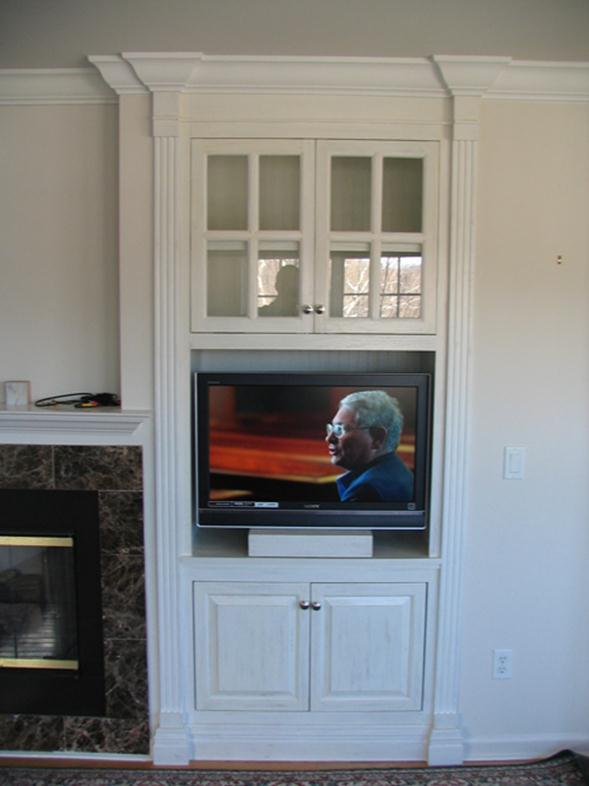 This custom built-in features a double glass door display cabinet that is set above a large media shelf. The media shelf contains a special swivel and slider unit, which allows the monitor to extend beyond the cabinet and swivel 180 degrees. The lower cabinet has double raised panel doors with pocket sliding hardware. |
