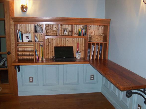 Knotty pine beaded paneling lines the cabinet’s backing. Center cubby accommodates enough space for the laptop and some pencils. Cabinet features plenty of storage and organizers for the paper and office accessories. Cabinet is trimmed with a solid crown moulding and the table is constructed from reclaimed lumber. |